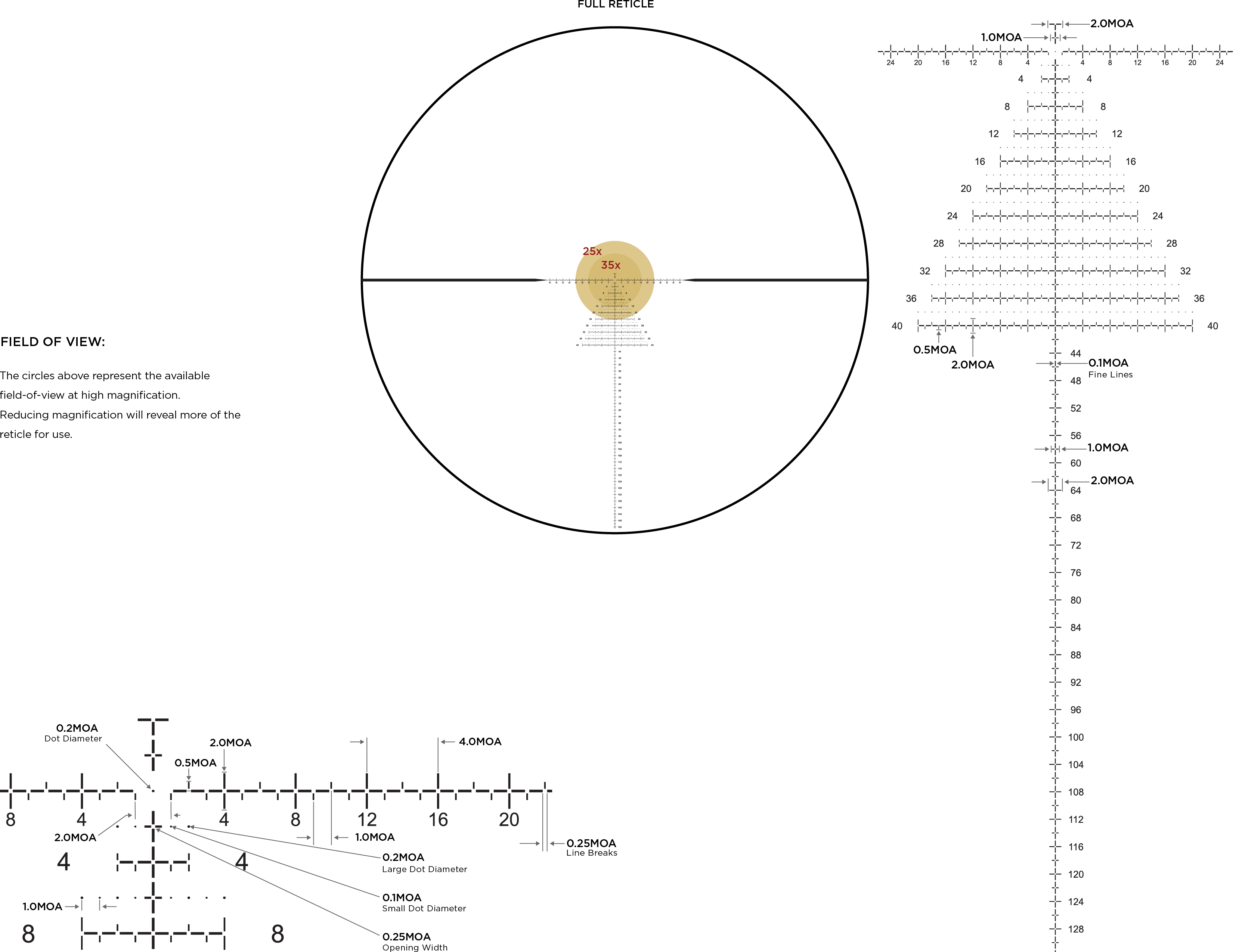 These low-profile dials are available on select models and provide up to 71.5MOA of adjustment in 3 revolutions and 1/4 MOA clicks. Visual and tactile revolution indicators ensure you dont get lost in the travel. The ZeroLock feature prevents inadvertent adjustments and ensures accurate return to zero. - First Focal Plane